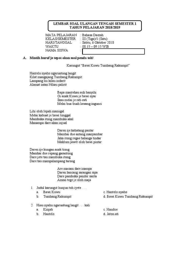 Berikut adalah beberapa contoh soal bahasa daerah yang dapat digunakan dalam evaluasi pembelajaran di kelas 3 semester 1. Soal-soal ini mencakup berbagai aspek, mulai dari kosakata, tata bahasa, pemahaman teks, hingga pengetahuan budaya lokal.