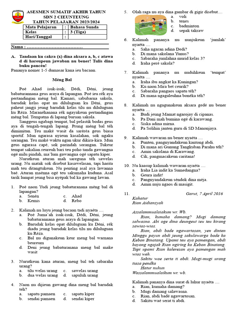 Conto Soal Basa Sunda Kelas 3 SD